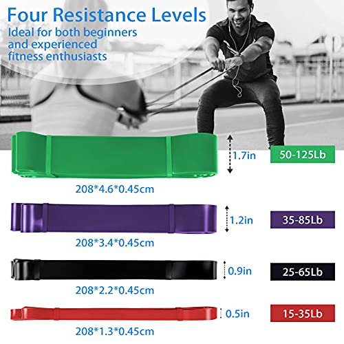 4 LIVELLI DI POTENZA: rosso 15-35 Lb, nero 25-65 Lb, viola 35-85 Lb, verde 50-125 Lb. 4 diversi colori e cinture ad anello di indicazione del peso chiare sono adatte per 4 diversi livelli di potenza. Puoi usare solo 1 o 2 diverse fasce di resistenza alla volta, così puoi ottenere il livello di forza di cui hai bisogno quando fai pull-up o esercizi quotidiani.