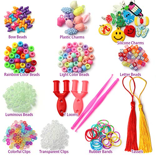 【Confezione di ricarica per elastici super preziosi Il nostro kit di elastici arcobaleno include oltre 2200 elastici in 15 colori brillanti, 60 perline rotonde colorate, 50 perline luminose, 100 clip S (colore arcobaleno e trasparenti), 17 ciondoli (frutta e cartone animato), 35 perline con lettere, 10 perline con nodo ad arco, 2 nappe, 2 uncinetti, 2 telai a Y. Una varietà di combinazioni di colori e accessori adorabili possono soddisfare le diverse esigenze dei bambini.