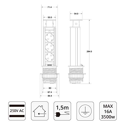 Elbe Inno Multipresa da scrivania a scomparsa con 3 Prese Italiane, multipresa torretta a scomparsa da tavolo, colonnina multipresa con protezione, prese a scomparsa per cucina,piani di lavoro,ufficio