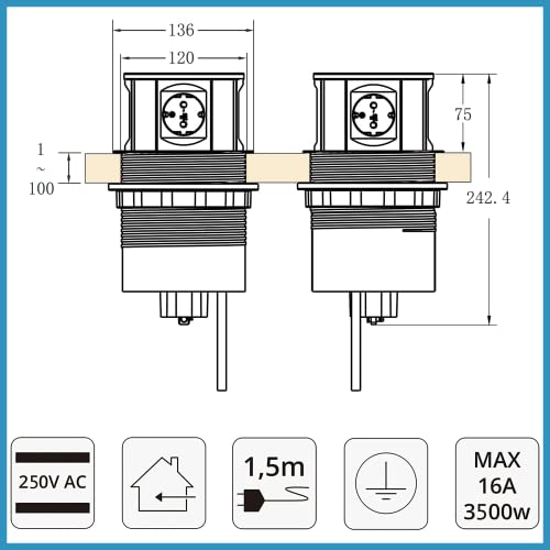 【Alta qualità e durevole】: la presa da tavolo è realizzata in lega di alluminio e plastica ignifuga. La copertura in acciaio inossidabile di alta qualità è semplicemente bellissima, è anche resistente.