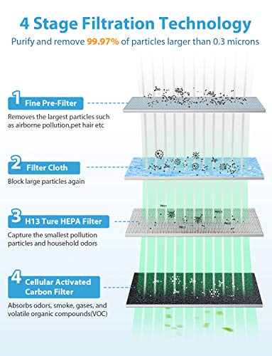 SISTEMA DI FILTRAGGIO A 4 STADI: Il pre-filtro, il tessuto filtrante, il filtro HEPA H13, e il filtro intrappola polvere al carbone attivo, peli di animale ecc, permette di assorbire odori degli animali, cucina, lettiera del gatto e altro.