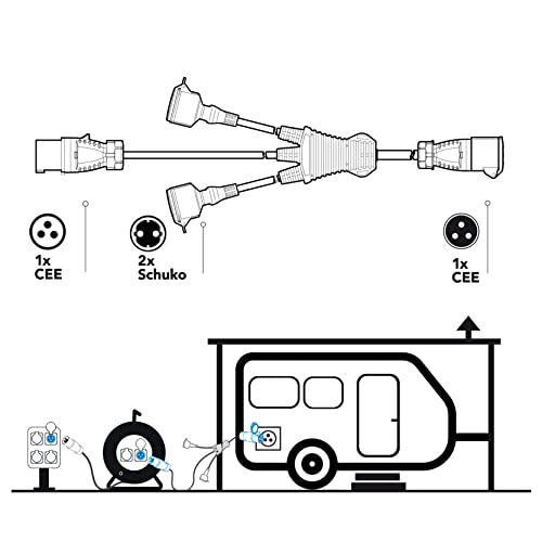 Cavo di Alimentazione Caravan triplo Splitter 3 vie: 2 Prese Schuko + 1 Presa industriale CEE