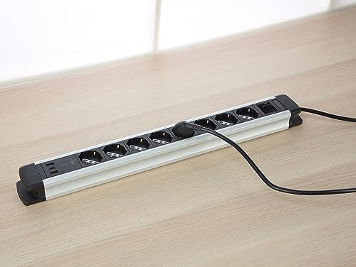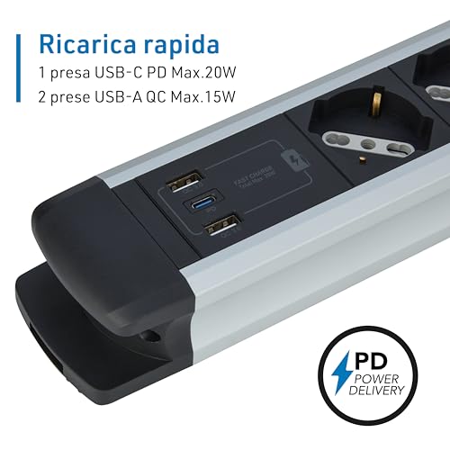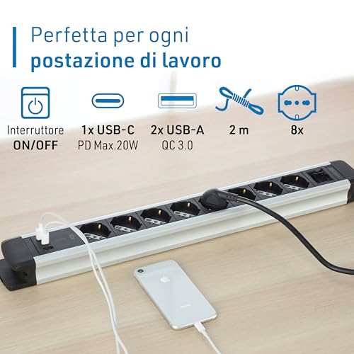 Electraline 61922 Multipresa Alu-Line 8 Posti Polivalenti, Schuko +10/16 A + 3 USB (2 USB A 3.0A + 1 USB C 20W Power Delivery) con Interruttore Luminoso ON/OFF, 2M, con Corpo in Alluminio