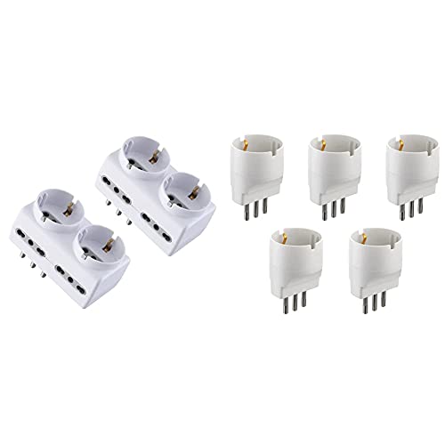 Electraline 92299 Set 2 Adattatori Multipresa 6 Posti 2 Schuko + 4 Bivalenti, Bianco & 92292 Set Adattatori Da Schuko A Spina Piccola, Bianco, Confezione Da 5