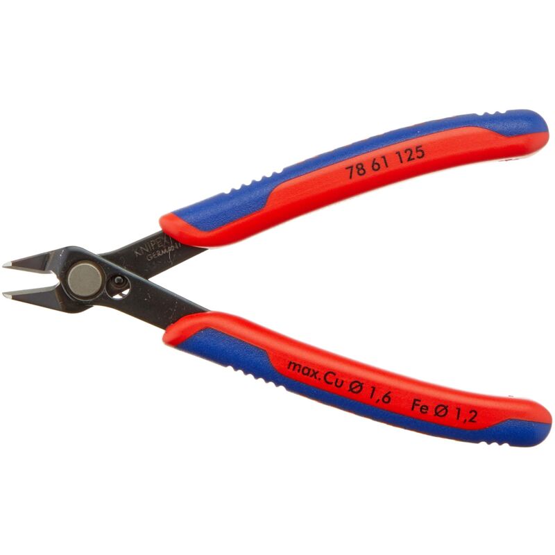 Pinza di precis. per tagli precisi, es. nel campo dell'elettronica e della meccanica di precisione Sezione di taglio con micro-spostamento controllato per un taglio ultrapreciso e una lunga durata Taglienti estremamente affilati troncano anche fili metallici poco sporgenti a partire dal Ø 0,2 mm Lavoro con min. sforzo grazie al peso contenuto e alla molla di torsione che rende il movim. agevole La molla di precisione e il limite di apertura garantiscono un ulteriore comfort Separa anche i cavi adiacenti a partire da 0,2 mm Ø · Giunto senza gioco ed accesso estremamente facile per lavorare senza affaticarsi con dispositivo di limitazione del carico · Rivestimento impugnatura in plastica delicata e non aggressiva sulle mani · Materiale acciaio speciale per utensili, testa brunita.Separa anche i cavi adiacenti a partire da 0,2 mm Ø · Giunto senza gioco ed accesso estremamente facile per lavorare senza affaticarsi con dispositivo di limitazione del carico · Rivestimento impugnatura
