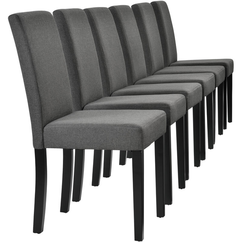 6 Sedie in un design nobile Dettagli del prodotto: - Superfice sedia in tessuto (100% Poliestere) - Lavorazione di alta quaitá - Gambe della sedia di legno Misure: Altezza: 90cm Larghezza: 42cm Profonditá: 48cm Altezza sedile: 47cm Colore: Grigio scuro, game della sedia nere La consegna comprende: 6 x Sedie Prodotto marca di casa: [ en. casa]