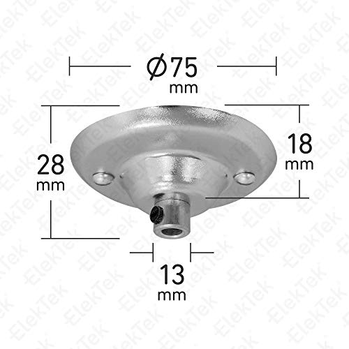 Aspetti importanti: Ideale per la creazione di arrangiamenti tradizionali di lampade a sospensione/lampadine. Dimensioni: Diametro 75mm, Profondità 18mm. Fori di fissaggio centri 50mm. aperture 13mm per serracavo. Da utilizzare con 2 o 3 morsetti flex. ElekTek porta catena, cavo, supporti flex e lampada disponibili