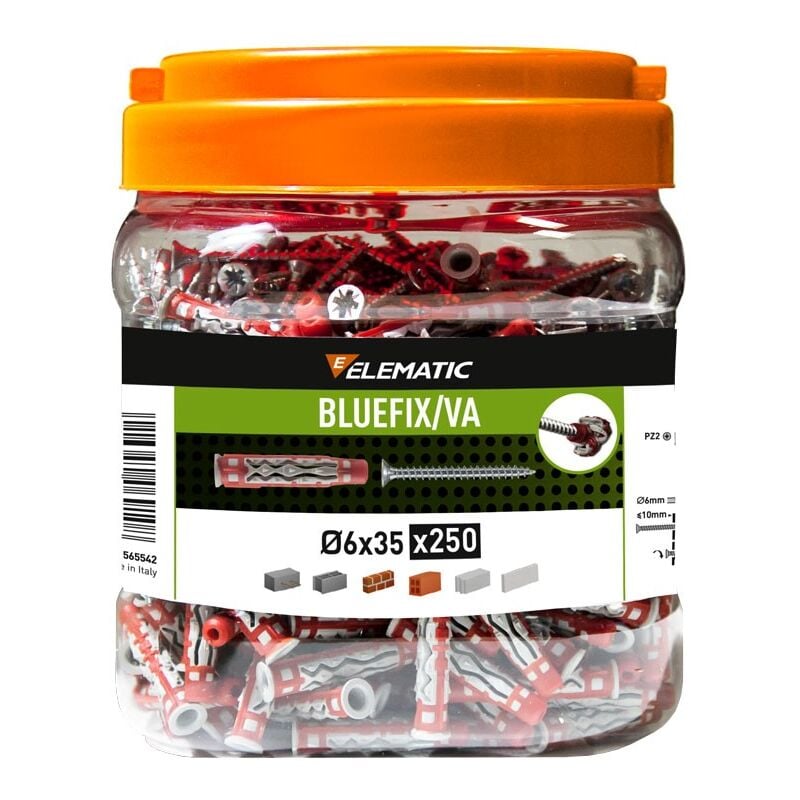 Barattolo Box con 250 tasselli Bluefix/VA Elematic. Caratteristiche Tasselli: Diametro Foratura: 6 mm Lunghezza ancorante: 35 mm Profondità di foratura: 50 mm Diametro Vite: 4.5 mm Lunghezza vite: 50 mm Max Spessore fissabile: 10 mm. BLUEFIX è il primo ancorante leggero bi-materia che assicura alte prestazioni su qualsiasi tipo di materiale grazie alla combinazione di due materiali con due diverse rigidezze: il materiale grigio garantisce un'elevata flessibilità in annodamento, mentre il materiale blu, rinforzato, conferisce all'ancorante la giusta rigidezza per un serraggio solido con una coppia progressiva e controllata. Inoltre BLUEFIX è stato testato su tavola vibrante in ambito sismico su calcestruzzo fessurato, non fessurato e muratura. Vantaggi: Versatilità e performance su materiali vuoti, supporti compatti, cartongesso, calcestruzzo cellulare e alleggeriti Coppia progressiva ed esponenziale che garantisce un controllo nel serraggio per una presa perfetta Funzionalità e