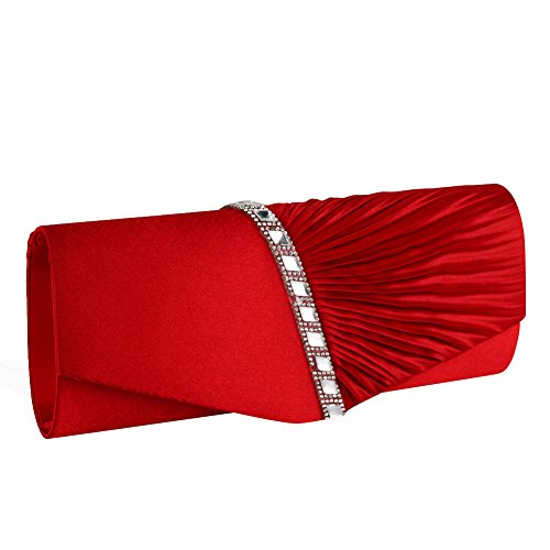 Ele Eleoption, borsetta da donna in raso a pieghe, con strass, da sposa, da ballo, da sera, per feste, Rosso
