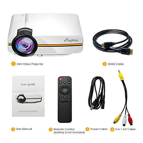 Elephas, mini proiettore LED, supporta risoluzioni 1080p HD, per HDMI, VGA, AV, USB, SD, da 1500 Lumen, per TV, PC, laptop, auricolari, iPhone, film e video giochi, di colore nero