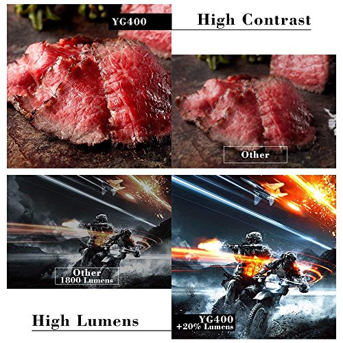 Eccellente qualità delle immagini: puoi regolare le dimensioni delle immagini da 50 a 130 pollici (meglio con quelle da 100 pollici).La distanza di proiezione è di 1,5-4 m (l'ideale sono 2 m).Risoluzione di base: 800 x 480p e supporta fino a 1080p. Contrasto da 1000:1.-Per la migliore qualità delle immagini, scegliere un posto scuro con una superficie molto riflettente.