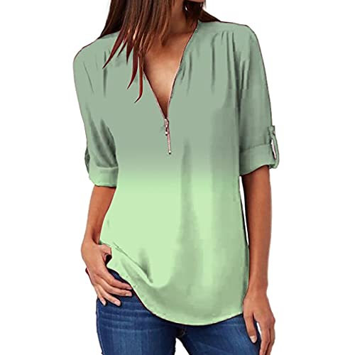 Elesoon Camicia da donna a maniche lunghe in chiffon, tinta unita, colore ombre, elegante sfumatura, taglie forti, Verde, 46