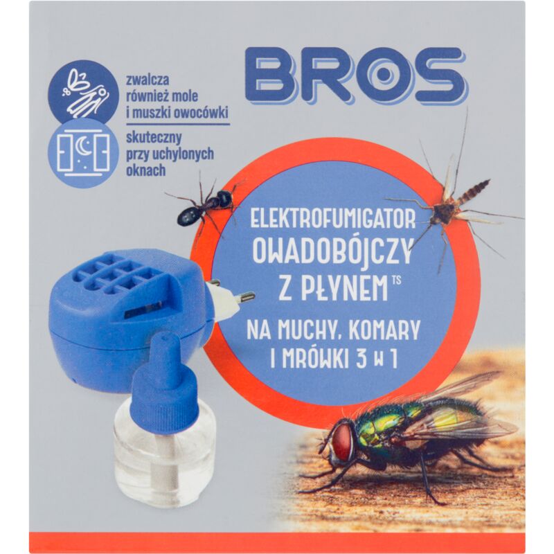 BROS ELECTRO + LIQUIDO MOSCHE, ZANZARE E FORMICHE Elettrofumigatore con liquido ad ampio spettro per combattere mosche, zanzare e formiche. Il principio attivo rilasciato gradualmente protegge gli ambienti sia di giorno che di notte e impedisce inoltre l'ingresso di ulteriori insetti. È efficace anche con le finestre aperte e le luci accese. **