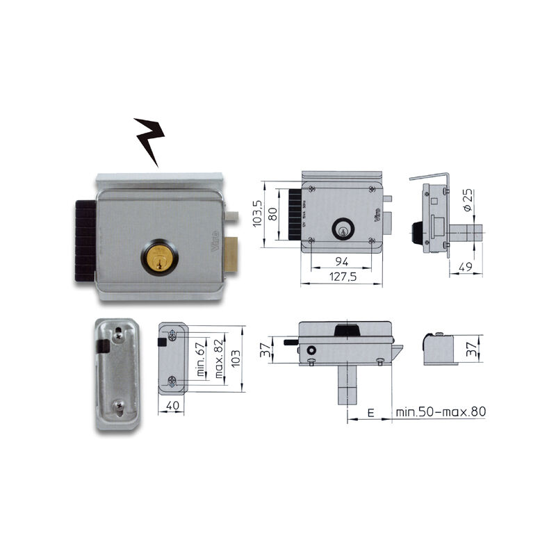 Scatola e bocchetta in acciaio zincato, tensione 12v AC, scrocco autobloccante, entrata regolabile con una semplice operazione attravesso la chiave a brucola in dotazione, apertura dall'interno con chiave, cilindro fisso tondo, dotazione: 3 chiavi profilo VIRO, mod. V97