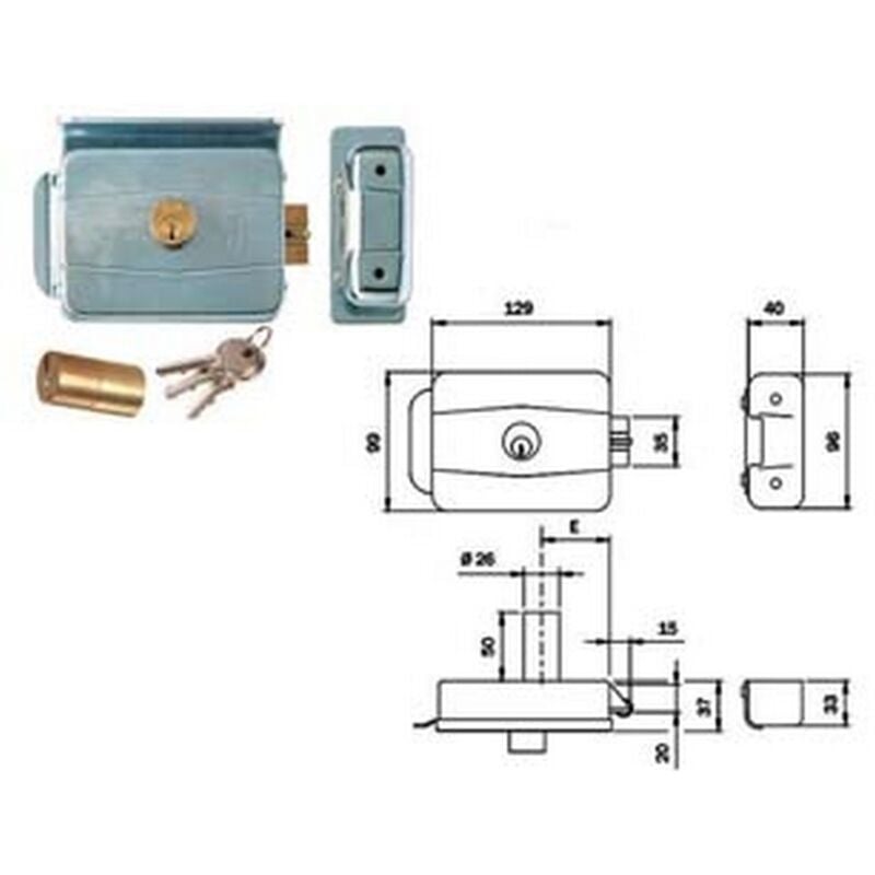 Da applicare destra o sinistra zincata per ferro - 12v ac 15w - cilindro interno e cilindro fisso ? mm.26x50 esterno - scrocco autobloccante con pistone di carica incorporato - 3 chiavi - bocchetta regolabile - confezione con tettuccio piastra porta serra