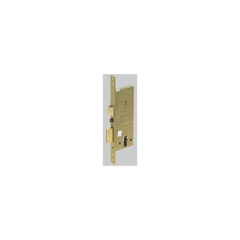 Scrocco reversibile e catenaccio a 2 mandate azionati dalla chiave, dal pulsante meccanico e a distanza mediante impulso elettrico a basso voltaggio: 12V.Bordi quadri. Finitura acciaio verniciato. A infilare.