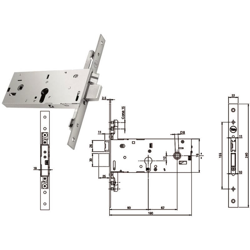 Per fascia alta - scrocco reversibile regolabile da mm.12 a mm.17 con fermo a giorno - catenaccio a 1 mandata maggiorata a mm.25 - dispositivo di fermo a giorno ad inserimento/disinserimento facilitati - reversibile - 3 punti di chiusura - asole per il montaggio facilitato delle aste interne /esterne - coprifrontale in acciaio inox - cilindro e contropiastre da ordinare a parte - senza aste - scatola mm.78h. - interasse mm.67 - frontale mm.22
