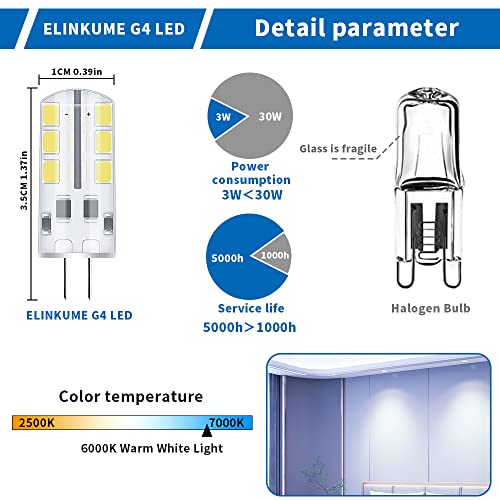 ELINKUME Lampadine G4 Led,3W Equivalenti 23W Lampada Alogena,Risparmio Energetico,260LM 6000K Bianco Freddo,DC 12V,Senza Sfarfallio,G4 LED Pin Cap,360 Grado,10 Pezzi