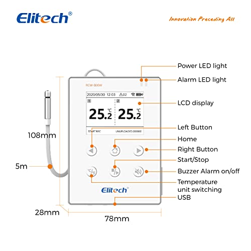 Elitech Data Logger di Temperatura, Monitoraggio Remoto Wireless, Doppio Sensore di Temperatura Esterno, Avvisi e Dati Storici, App Mobile, Gestione Cloud, Notifica Push, RCW-800W TDE