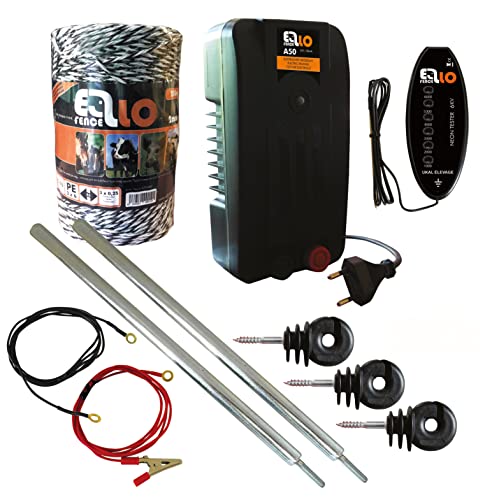 Ellofence - Set per recinzioni, con filo di recinzione per pascoli, paletti, isolatori e tester, dispositivo estremamente silenzioso, 230 V