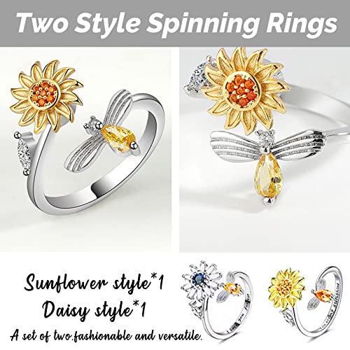 Ellxen 2PCS Anelli l'Ansia Spinner Anelli Piccola margherita girasole Anelli Sottili Regolabili Fidget Anello Antistress Anelli Anello Donna Acciaio Inossidabile Zircone Fiore Anelli Set