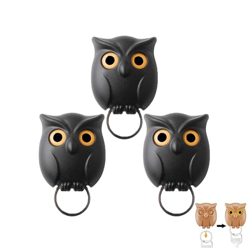Ellxen 3 pezzi Night Owl Key Holder,Owl Shape Wall Key Hook Hanging Hook Holder Key Ring,Creative Automatic Open Close Eyes Owl Key Holder,für Home Office Door Entranc(nero)