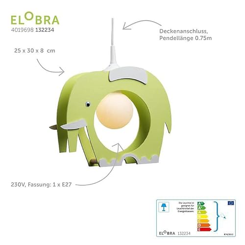 Elobra Lampada da soffitto, lampadario a sospensione per bambini, motivo: elefante, in legno, colore: verde chiaro, legno;