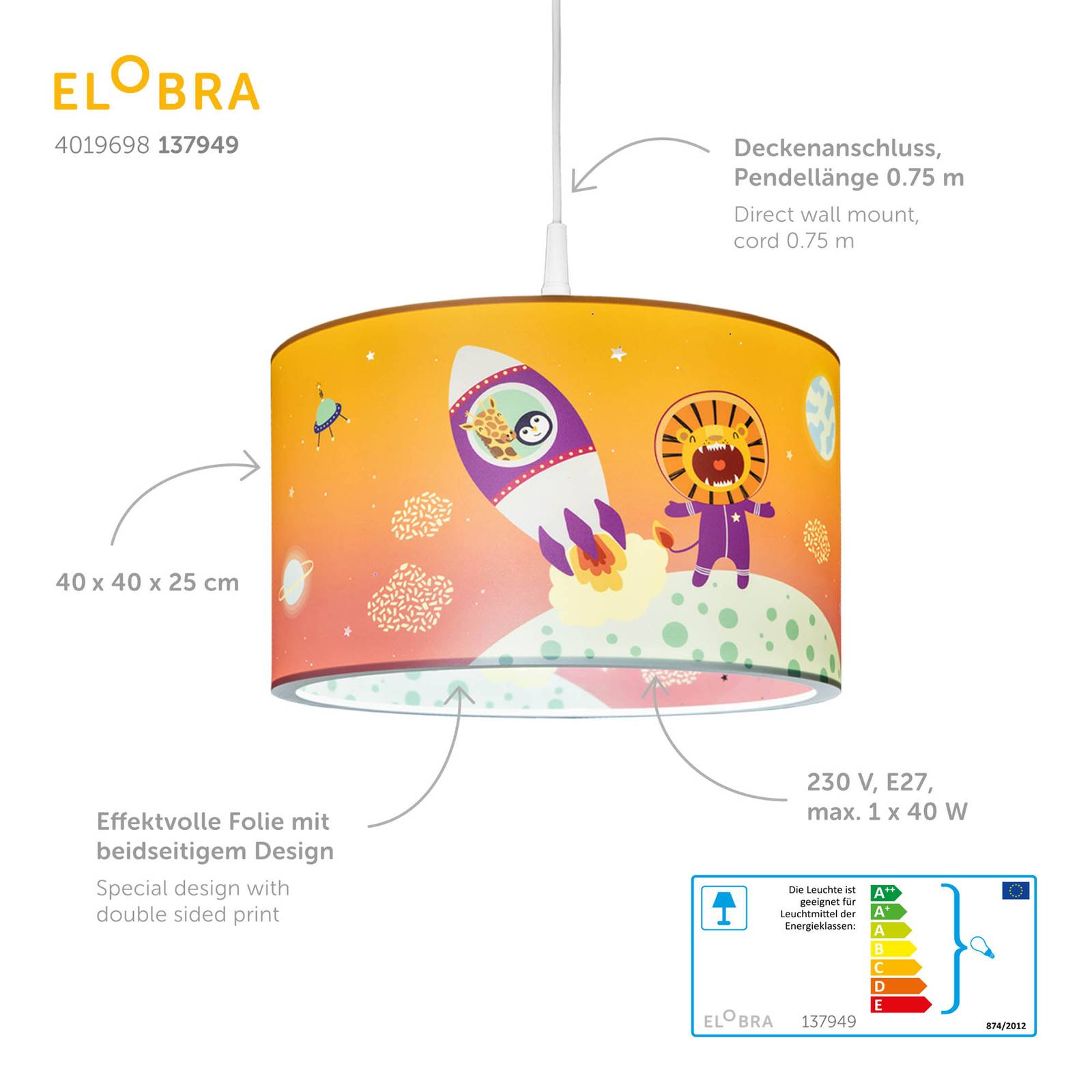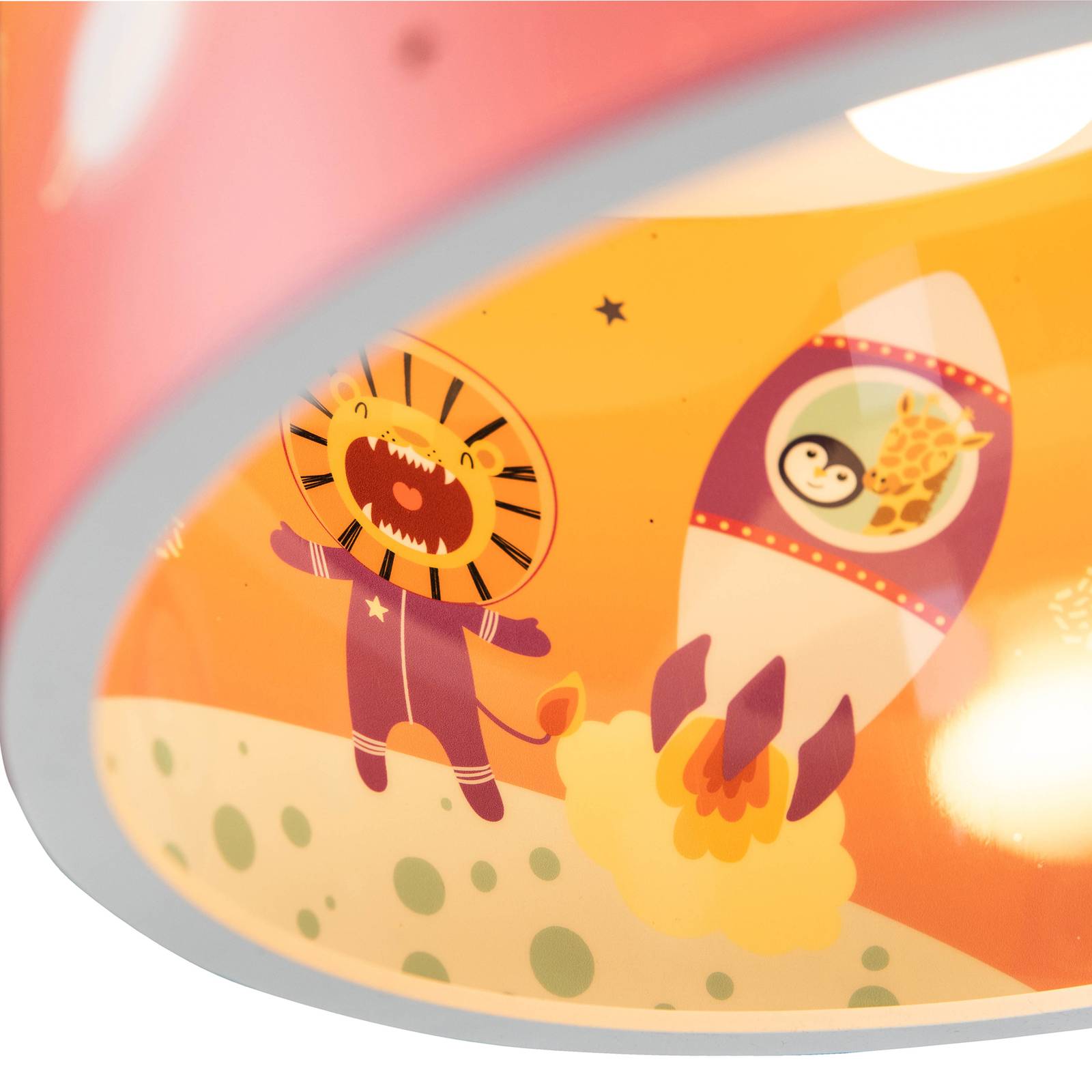 Lampada a sospensione Escape con grande motivo per la camera dei bambini La moderna lampada a sospensione Escape è dotata di un paralume rotondo, che mostra un grande motivo illustrato dallo spazio. Chi non vorrebbe essere forte come il leone o decollare con la giraffa e il pinguino in un razzo verso le stelle? L'ombrello stesso è stampato anche all'interno, in modo da creare un grande effetto all'accensione della luce. Oltre al motivo fantasioso, la lampada a sospensione offre anche una buona illuminazione della stanza e una luce soffusa.