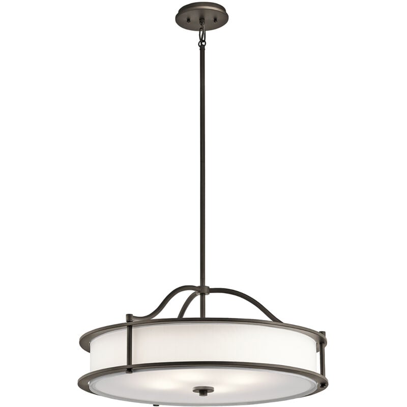 Collezione Emory DESIGN SOBRIO Lampada a sospensione/soffitto a 4 luci . La collezione contemporanea Emory ha un design pulito e sobrio in finitura bronzo antico o peltro classico con paralume a tamburo in tessuto bianco sporco e diffusore in vetro.