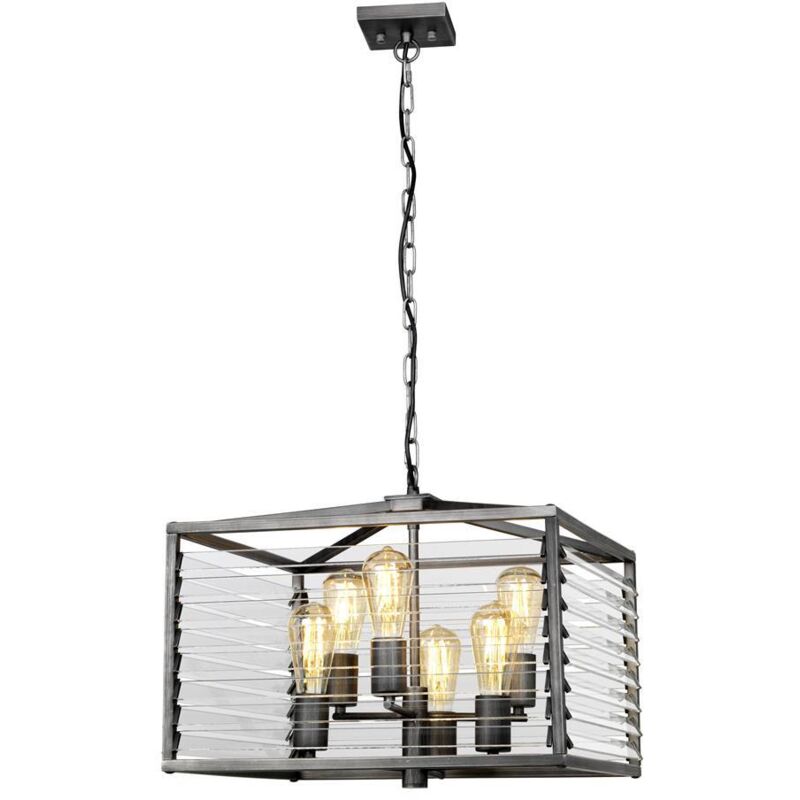 Collezione Louvre CATTURA LA TUA ATTENZIONE Lampada a sospensione a 6 luci . La forma della serie Louvre, che cattura l'attenzione, nasce dalla giustapposizione tra la delicatezza della finitura argento/nero spazzolato e le dure lamelle angolari di vetro trasparente. Le lampadine a filamento rifiniscono l'aspetto, completando la morbida estetica industriale.