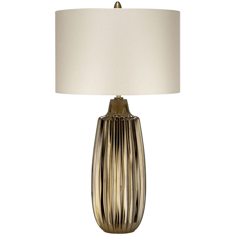 Collezione Newham CERAMICA SCOLPITA Lampada grande da tavolo a 1 luce. Questa ceramica scolpita color bronzo è arricchita da un paralume satinato con trama perlata e rivestimento in PVC bianco. Newham si adatta facilmente alla maggior parte degli interni, abbinandosi bene a stili naturali e contemporanei.