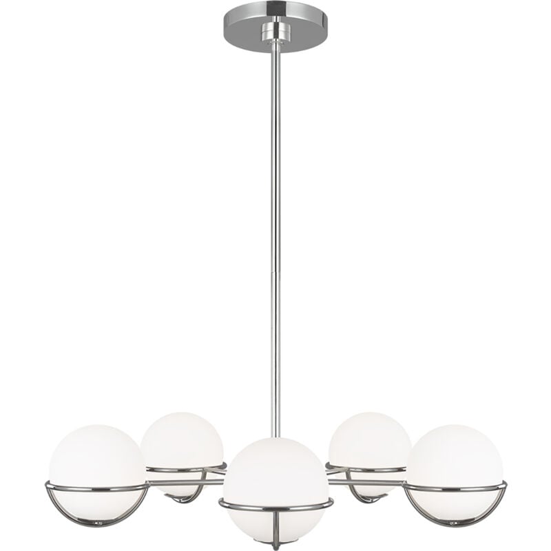 Collezione Apollo CONTRASTO AFFASCINANTE Lampadario a 5 luci - Nichel lucido. La lampada modernista Apollo colpisce per i suoi globi di vetro bianco opalino acidato perfettamente bilanciati, che poggiano delicatamente su una cornice sferica in ottone brunito o nichel lucido. Il fascino cosmico di Apollo e il suo design artistico di metà secolo diventeranno sicuramente il punto focale di qualsiasi spazio.