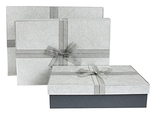 Emartbuy Set di 3 rigida scatola regalo di presentazione, scatola grigio scuro con coperchio argento, interno marrone e nastro decorativo in tessuto grigio