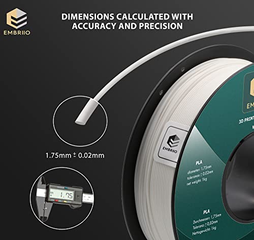 Filamento EMBRIIO 3D PLA dal diametro preciso di 1,75 mm, con tolleranza di ± 0,02 mm, disponibile in bobine da 1 kg (2,2lbs) | Bianco