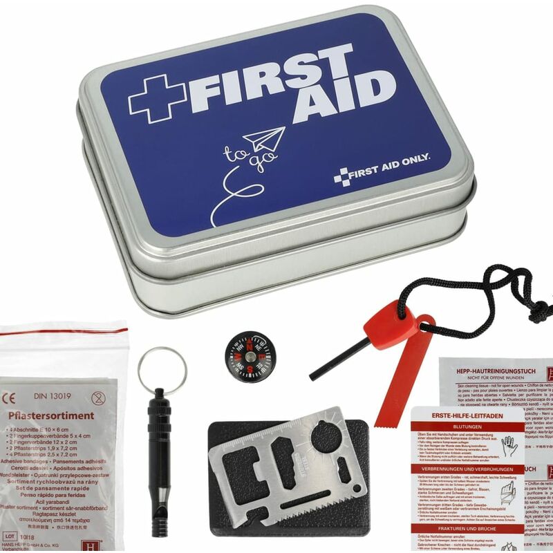 contiene un set di cerotti da 14 pezzi, panni per la pulizia della pelle, una bussola, un accendi fuoco, uno strumento multifunzione ingegnoso (con 11 funzioni) in formato carta di credito. Sono presenti anche un fischietto di emergenza e le istruzioni per il primo soccorso. Scatola decorativa in metallo: Questo set di primo soccorso è contenuto in una scatola decorativa realizzato in metallo resistente. Pratico kit di emergenza: L'ampio set di sicurezza medica è davvero indispensabile per le attività all'aperto e per l'uso quotidiano. È compatta e presenta un design salvaspazio che consente una facile conservazione e un trasporto sicuro. Colore: Argento Dimensioni: 10 x