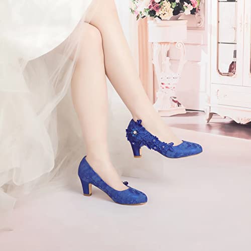 Emily Bridal Scarpe da Sposa Donna Raso di Seta Come Tacco Spesso Stiletto con Pizzo Fiore Cristallo Perla (EU38, Blu)