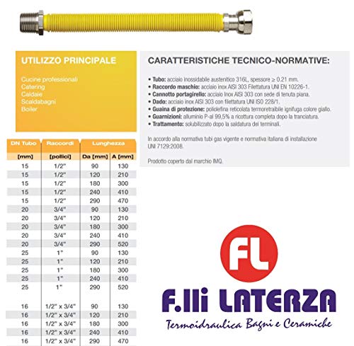 EMIPIU' TUBO GIUNTO FLESSIBILE ESTENSIBILE ACCIAIO INOX PER GAS RISCALDAMENTO 1/2" DN 15 L. 240 x 410 mm Tubo Gas a Norma UNI 11353:2010 - MADE IN ITALY