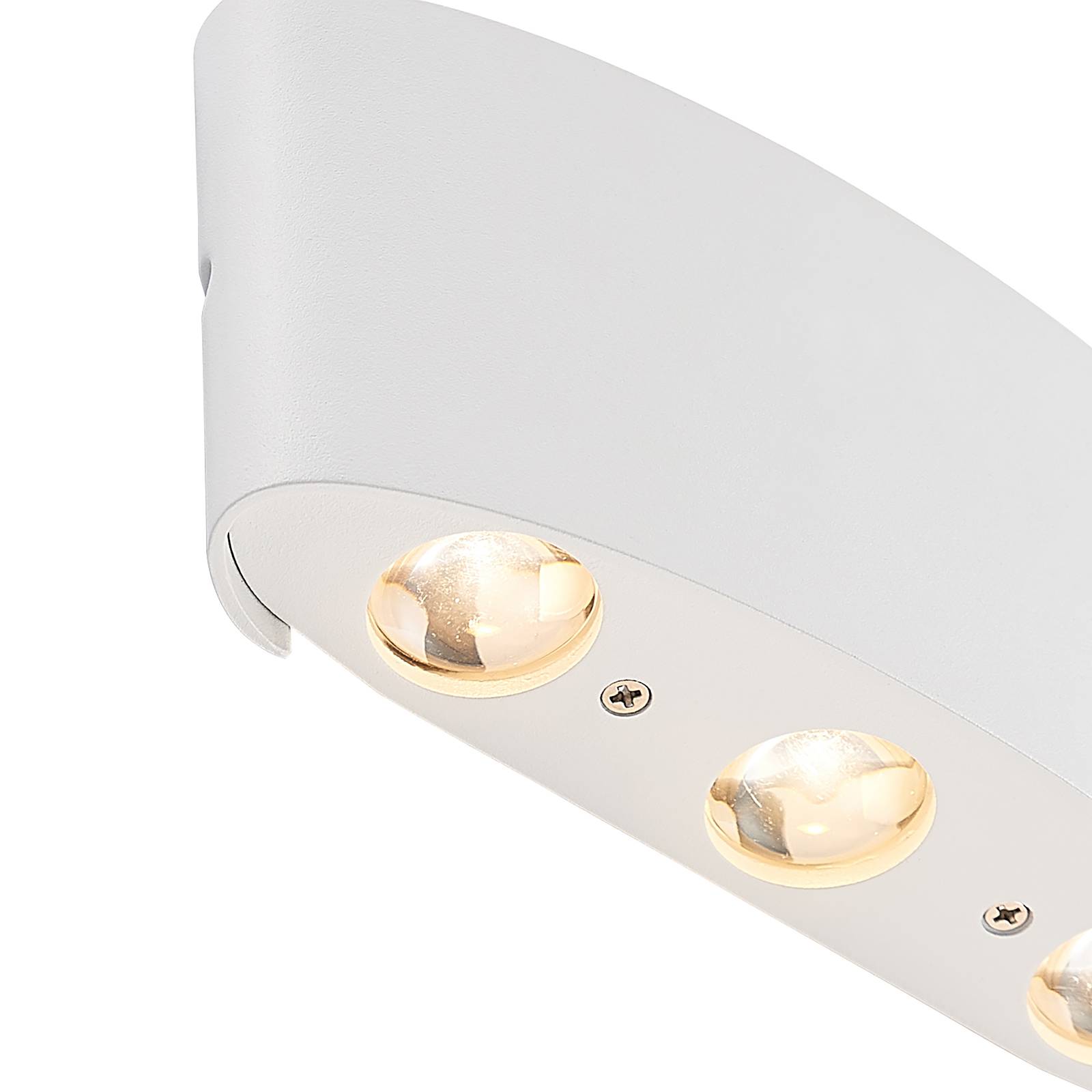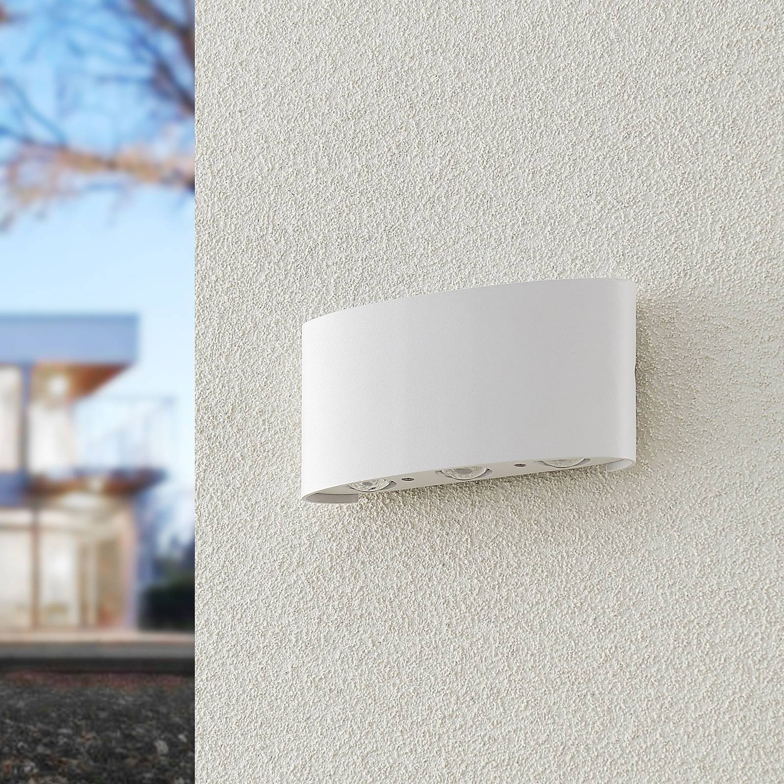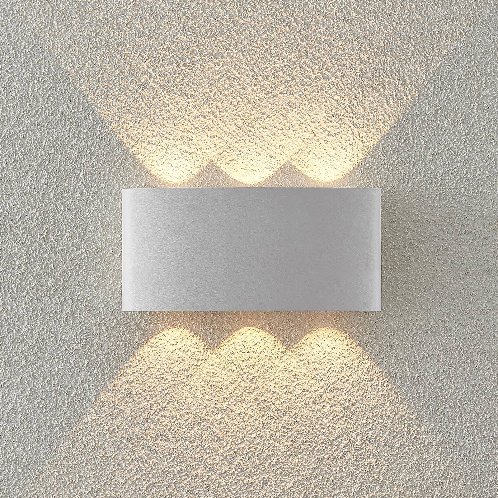 Apparecchio LED da parete per esterni Emirana in colori tenui L'apparecchio LED da parete per esterni Emirana colpisce per il suo design semplice, che si evidenzia soprattutto nella finitura della superficie bianca opaca. L'alloggiamento è in alluminio pressofuso e ha una forma allungata ma arrotondata, che dà un'impressione armoniosa. Il modulo LED installato in modo permanente emette una luce bianca calda che viene emessa indirettamente in modo da evitare l'abbagliamento. L'aspetto discreto di Emirana lo rende adatto a molti ambienti diversi e può essere utilizzato sia nelle zone d'ingresso che in quelle di terrazza.
