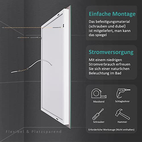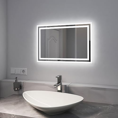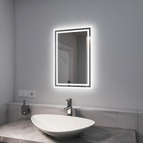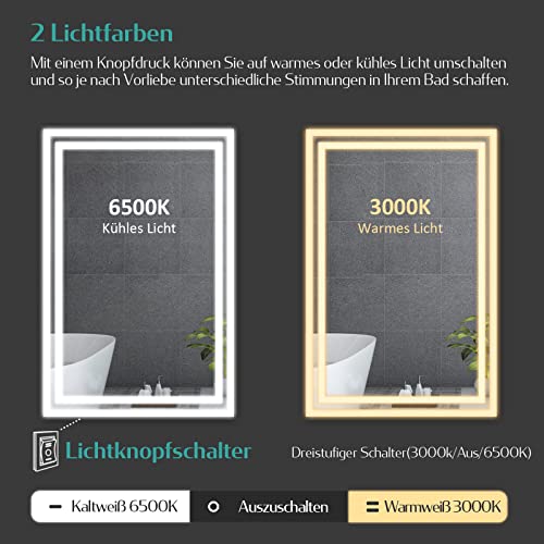 EMKE Specchio da bagno con illuminazione, 40 x 60 cm, LED da bagno, anti nebbia, interruttore meccanico, luce calda e luce bianca fredda