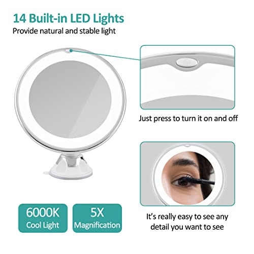 EMKE Specchio da barba con ingrandimento 5x, con luce, LED da viaggio, con supporto a ventosa di bloccaggio, girevole a 360°, luce fredda, batteria, illuminata portatile per bagno