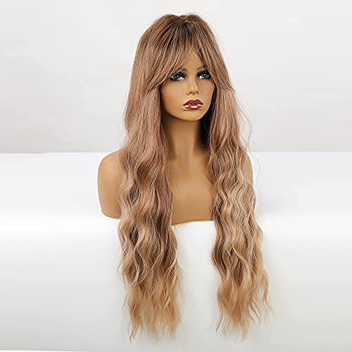 EMMOR Parrucche lunghe marroni per donna, capelli naturali sintetici con frangia Parrucche piene per uso quotidiano e per feste