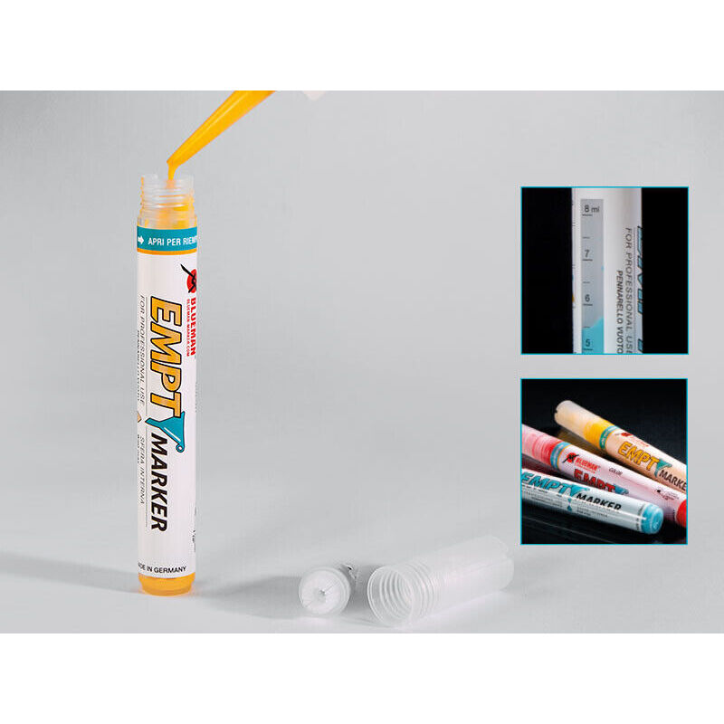 PENNARELLO 'EMPTY MARKER' BLUEMAN Marcatore vuoto da riempire con vostro colore per la personalizzazione del ritocco. Si può riempire con piccole quantità di colore standard o un mix personalizzato e lavorare in modo molto più preciso ed efficace delle bombolette, del pennellino o del dito. Gli indicatori di misura sul corpo trasparente facilitano il mix di colori e le sfere di metallo all interno consentono di miscelare al meglio lo smalto. Perfetto per i serramentisti occupa il minimo spazio nella cassetta degli attrezzi. Prodotto adatto per USO PROFESSIONALE. Caratteristiche Colore: Vuoto Contenuto max: 9 ml Con sfera interna Finestra trasparente graduata in ml Punta rotonda 4,5 mm NB: Acquista quanti pennarelli vuoi, paghi sempre un'unica spedizione di 6,50
