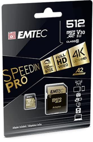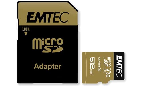 Emtec - Scheda microSD UHS-I U3 V30 A1-512 GB, 256 GB - ECMSDM256GXC10SP - Gamma Speedin - Con adattatore - Velocità di lettura e scrittura fino a 100 MB/s, 100 MB/s - Nero/Oro