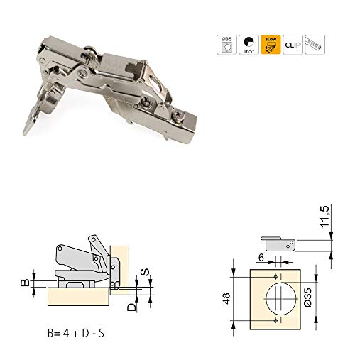 Emuca 1015307 Kit cerniera mezzo collo con scodellino Ø35mm 165° chiusura soft e basetta Euro con regolazione eccentrica, Set di 2