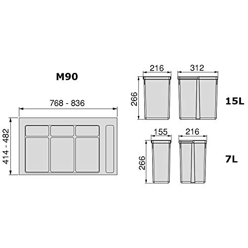 Taglia: H 266 x M 900, dimensioni contenitore 15 L: 26.6 x 21.6 x 31.2 cm, dimensioni contenitore 7 L: 26.6 x 15.5 x 21.6 cm