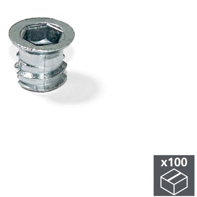 Bussola Per Fori Svasati Filettatura Metrica M8 Zama Zincato 100 Pezzi Emuca Lotto di bussole per fori con svasatura a filettatura metrica, prodotti in zama e utilizzati per avvitare perni o piedini regolabili in ogni tipo di mobile . La sua installazione si realizza per avvitamento su pannello di legno. Bussola da avvitare per foro svasato con filettatura mentrica M8. Utilizzata per avvitare perni o piedini regolabili in ogni tipo di mobile. L'installazione si realizza avvitandola nel pannello di legno. Per il montaggio è necessario di un foro diamentro 10 mm e 15 mm di profondità . Prodotto in zama zincata.
