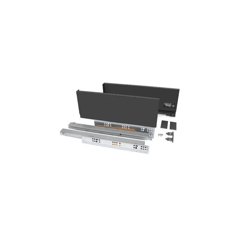 Kit per il montaggio del cassetto VERTEX con guide ad estrazione totale con sistema di chiusura ammortizzato. Portata kg.40. Scorrimento fluido e silenzioso. Sponda del cassetto in ferro verniciato color grigio antracite da mm.178. Spessore del fondo e della schiena mm.16. Regolazione orizzontale del frontalino mediante vite laterale +- 1.5 mm. Regolazione verticale del frontalino mediante eccentrico +- 2 mm. Il kit include tutti gli elementi per il montaggio di un cassetto esterno ad eccezione del frontale, le schiena ed il fondo include guide da mm.500, fianco mm.105, coppia di agganci frontali per cassetto esterno e kit di agganci posteriori.