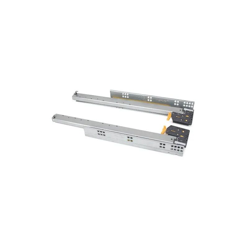 Set di guide ad estrazione totale con sistema di chiusura ammortizzato soft e agganci compresi per facilitare il montaggio e smontaggio rapido . Portata kg.30. Scorrimento fluido e silenzioso. Regolazione in 3 direzioni orizzontale +- 1.5 mm. verticale e in profondita' +- 3 mm. Autochiusura e rallentamento su entrambe le guide. Finitura zincato bianco. Set per profondita' mm.400.