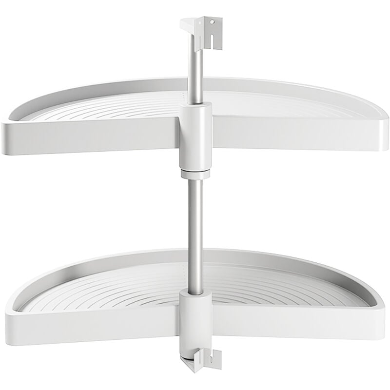 Cestelli girevoli mezza luna progettati per ottimizzare lo spazio in moduli ad angolo di cucina a forma di L. Sono facili da installare e adattabili a diverse altezze dei moduli. Sono disponibili per misure di moduli da 800 mm e 900 mm e finiture bianche e grigie . Il sistema è composto da 2 vassoi e accessori di montaggio in plastica riciclabile, antistatico, ad alta resistenza agli urti e ai raggi ultravioletti e una barra centrale in alluminio anodizzato opaco. Hanno una capacità di carico di 20 kg per vassoio . Cestelli girevoli 1/2 luna progettati per moduli angolari della cucina. Sistema composto da 2 cestelli e una barra in alluminio da installare in moduli da 900 mm. Facilità di montaggio con la possibilità di estrazione del cestello inferiore durante l'apertura della porta. Altezza 550 mm. Diametro dei cestelli 750 mm. Carico massimo di 20 kg per cestello. Possibilità di installare il cestello superiore a due diverse altezze. Cestelli prodotti in polietilene bianco