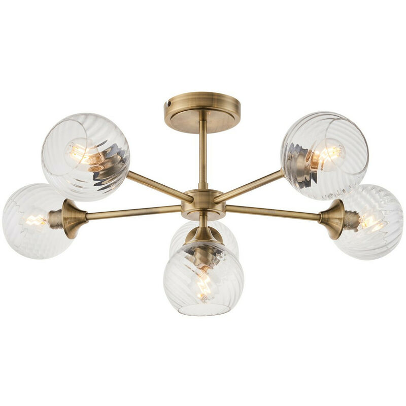 Endon Allegra Lampada da soffitto a semi-incasso con paralume in vetro a 6 luci, ottone anticato | Finitura: piastra in ottone anticato e vetro trasparente a spirale | Materiale: acciaio e vetro | Grado di protezione IP: IP20 | Proiezione: 33 cm | Diametro: 64 cm | Tipo di lampada: E14 | Numero di lampade: 6 | Lampadina inclusa: no | Dimmerabile: sì | Potenza (massima): 6 x 7 W
